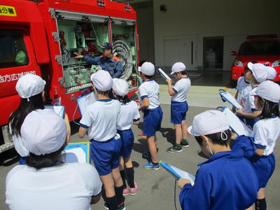 子どもたちは、消防署員の方々の説明を聞きながら、熱心にメモをとっていました。
