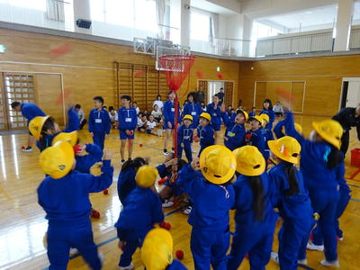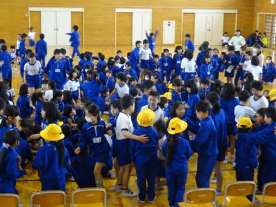 6年生に手を引かれて入場してきた1年生は、「猛獣狩りをしようよ」や「玉入れ」などのゲームをして、他の学年のみんなと交流を深めました。