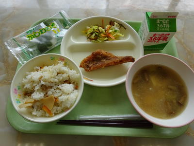 たけのこご飯、なめこ汁、赤魚の竜田揚げ、キャベツの浅漬け、牛乳、柏もちが出ました。
