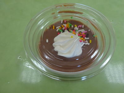 明日のバレンタインデーを前に、今日の給食には、調理員さん手作りのチョコプリンが出ました。