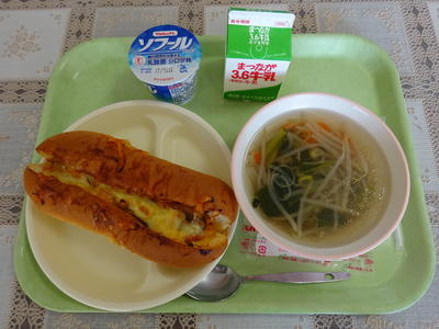 今日の給食には、ピザが出ました(その他には茎わかめスープ、牛乳、ヨーグルト)。