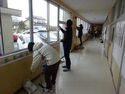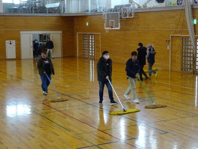 今回は、卒業式に向けて校舎の窓ガラスふきと体育館の床のワックスがけ、そしてベルマークの整理を行いました。
