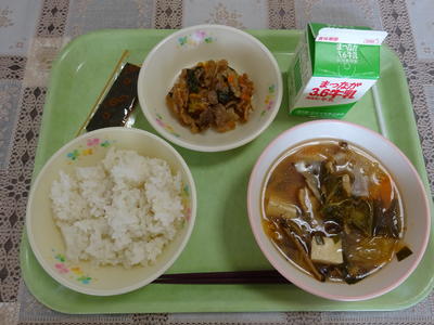 麦ご飯、プルコギ、トックスープ、味付けのり、牛乳が出ました。