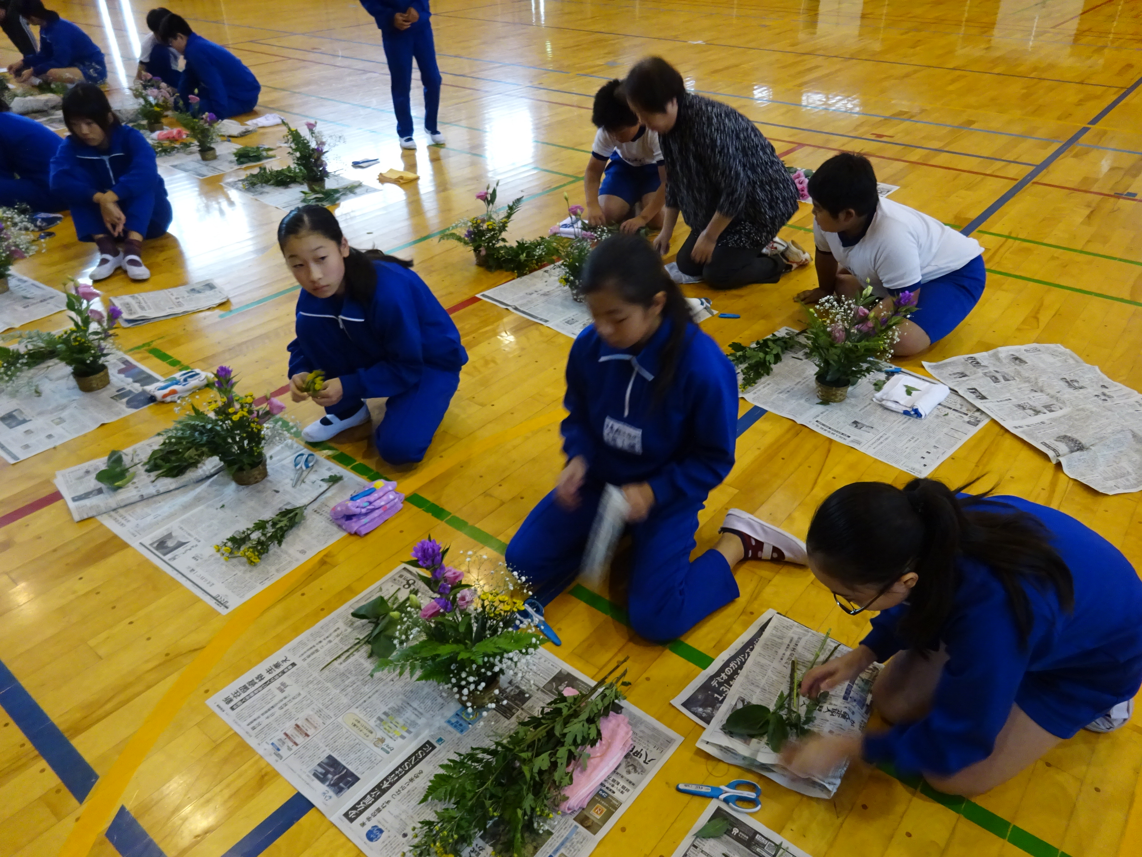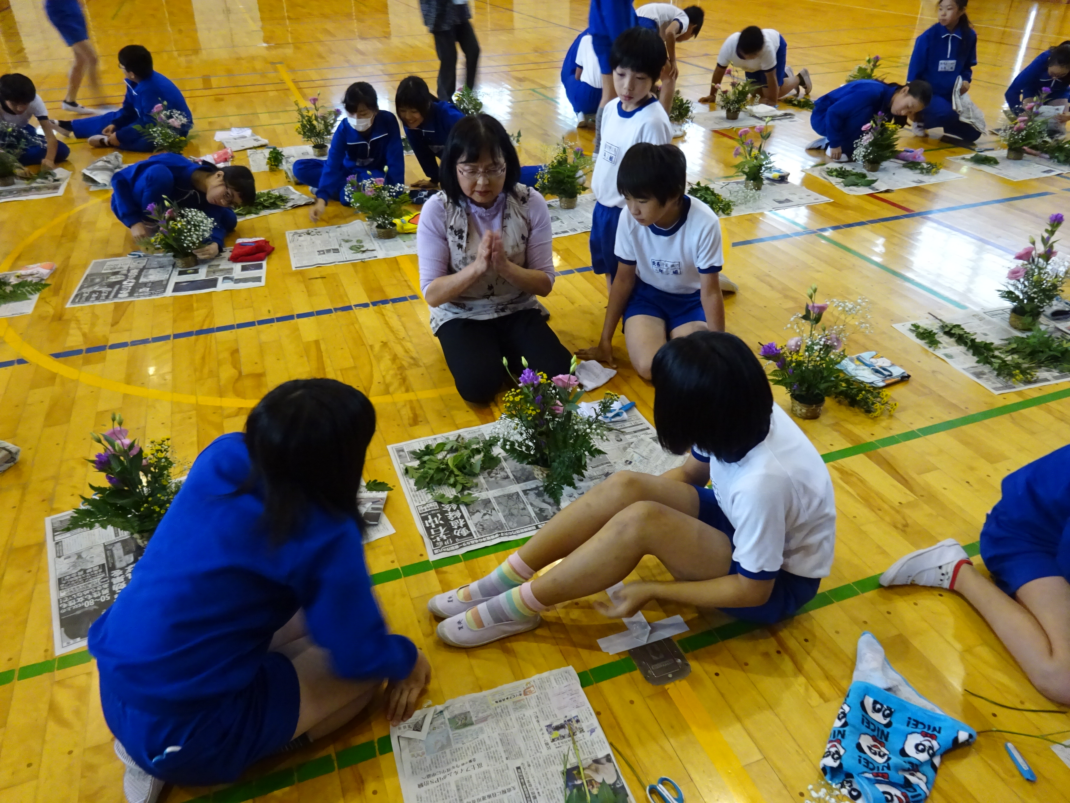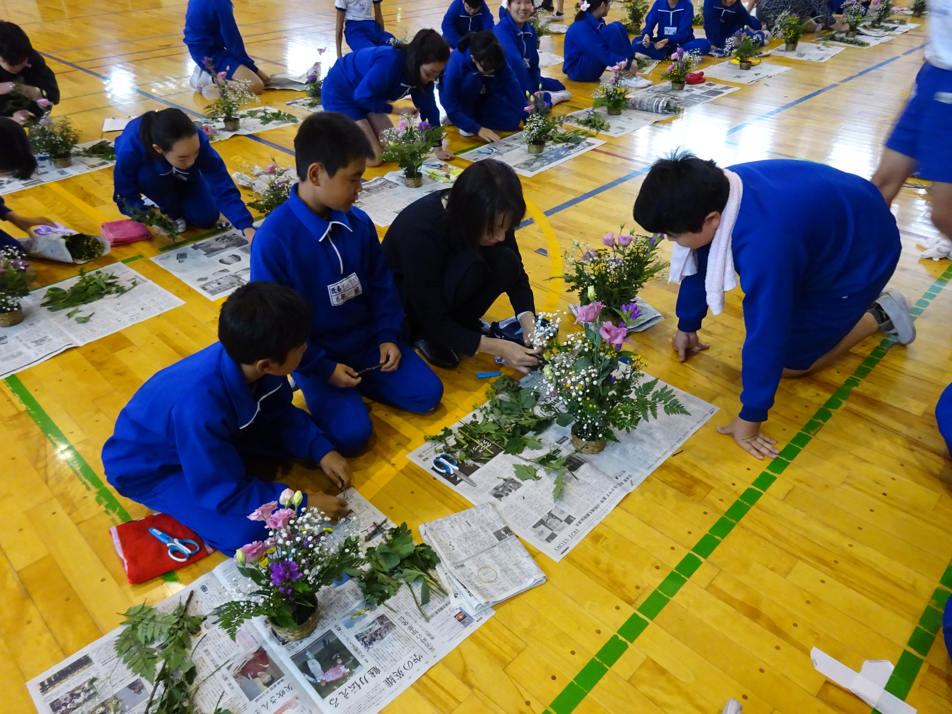 JAふくしま未来の佐藤さん、田部さんのご協力をいただき、6年生が生け花に挑戦しました。