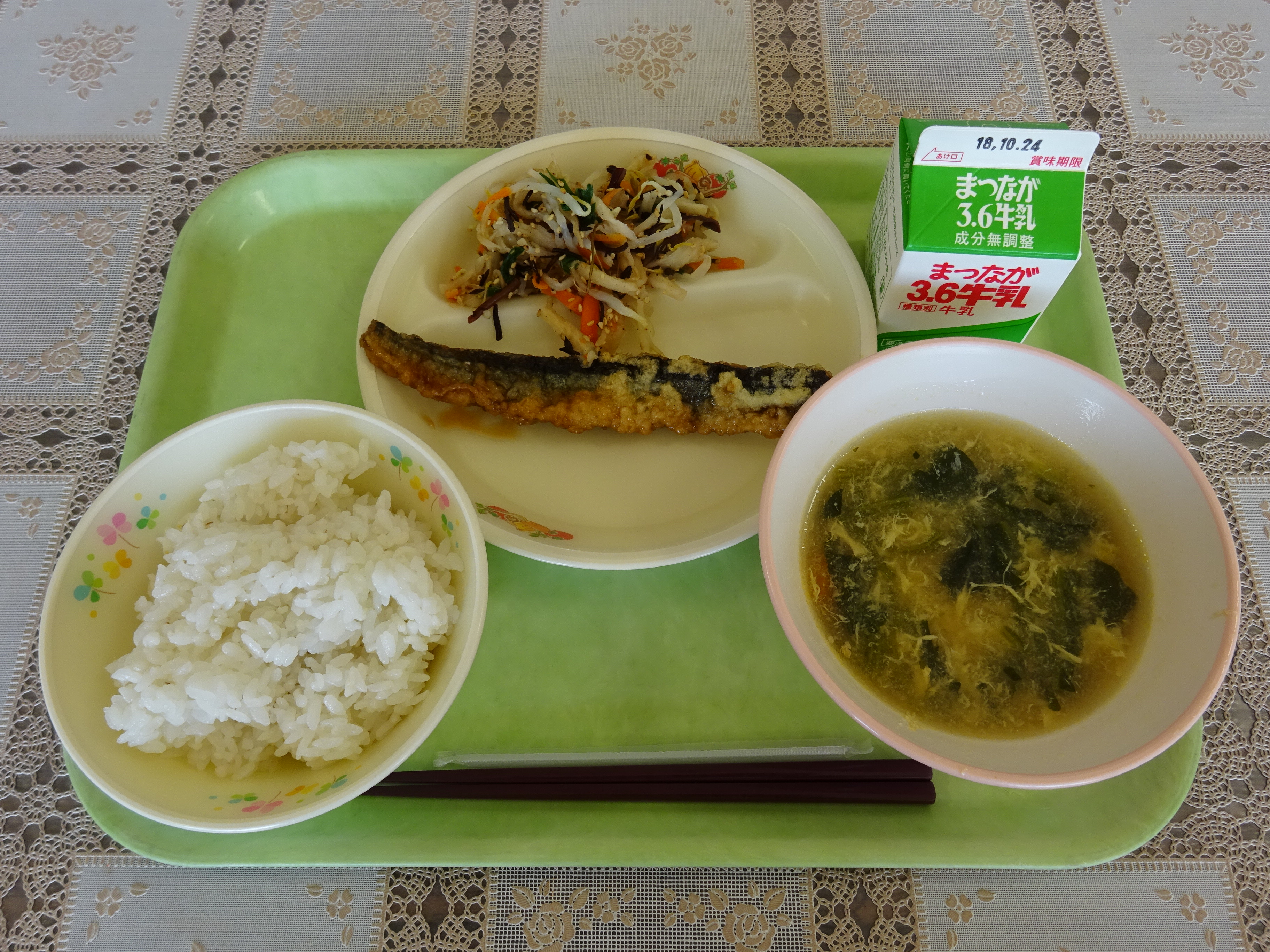 今週15日(月)にはきのこ豚丼、16日(火)には栗ご飯と鮭の塩焼き、そして今日はさんまの蒲焼きが出ました。