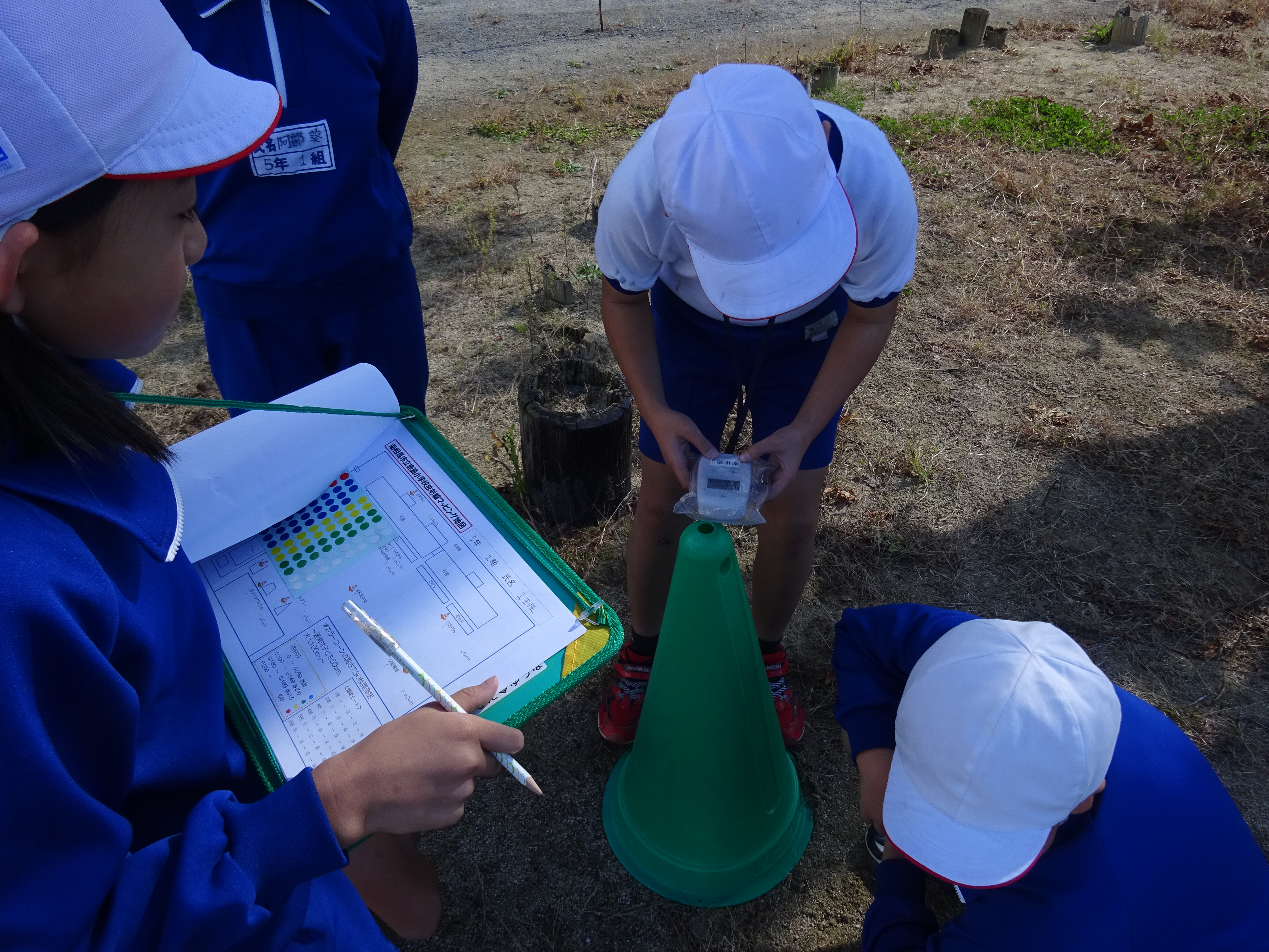 まず校庭に出て10箇所ほどのポイントを決め、その地点の放射線量を測定しました。