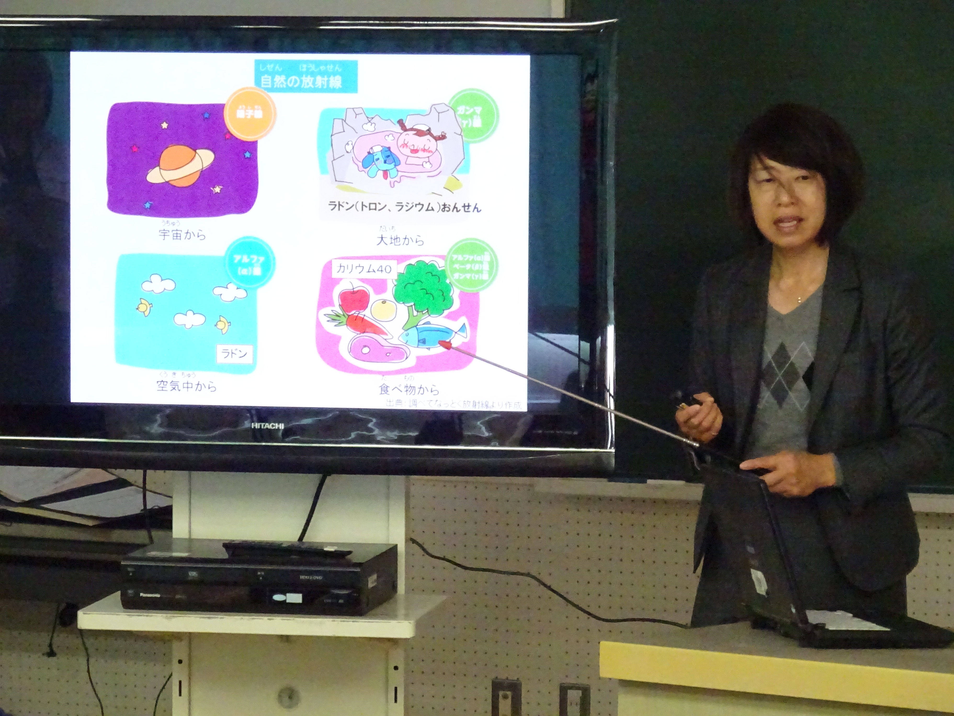 その後校舎内に入り、礒部先生から「放射能」と「放射性物質」「放射線」の違いや、世界各地の放射線量、自然界にある放射線、除染のポイントなどを教わりました。