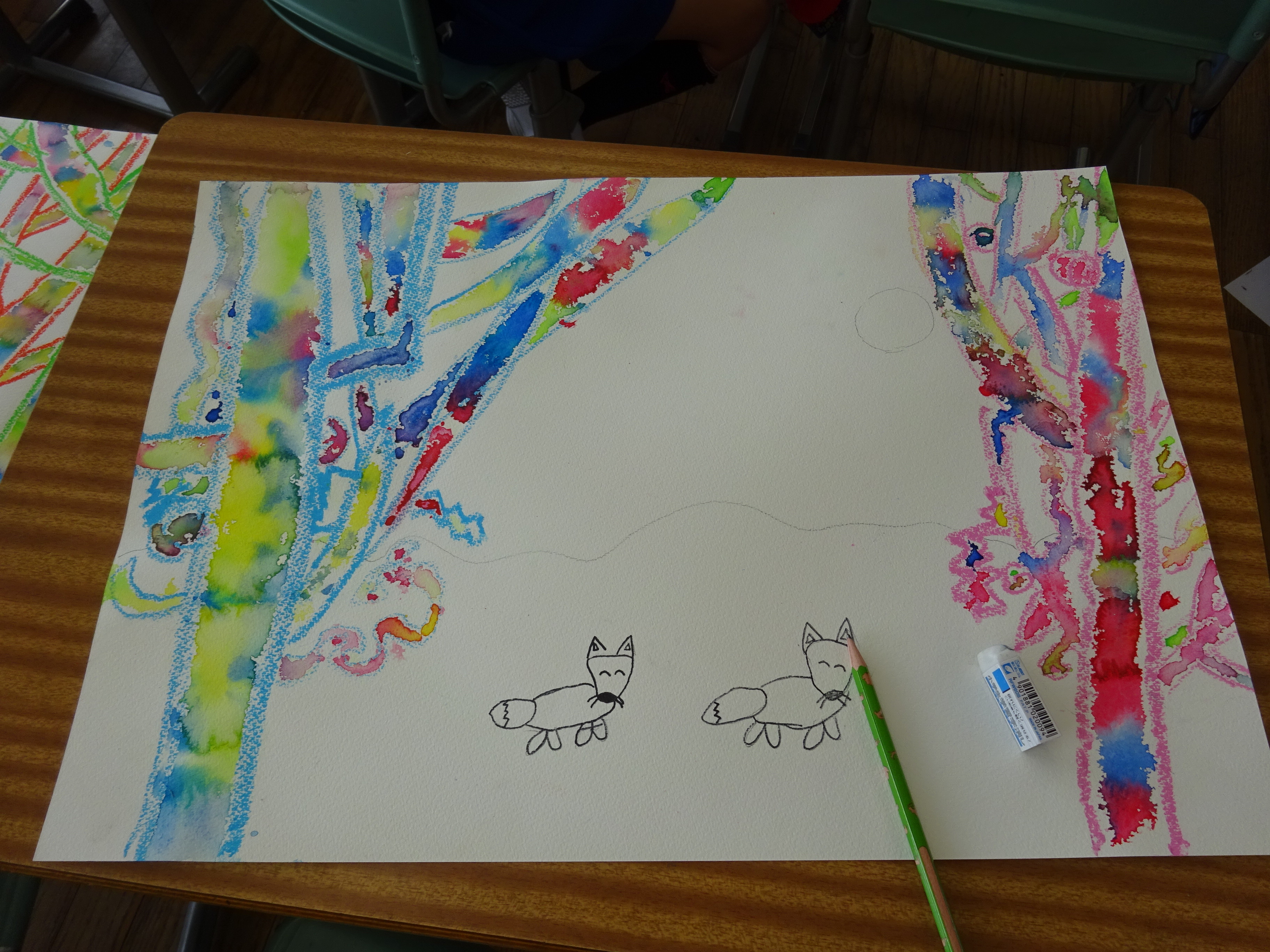 3年生の教室に行ってみると、図工の時間に「お話の絵」に取り組んでいました。