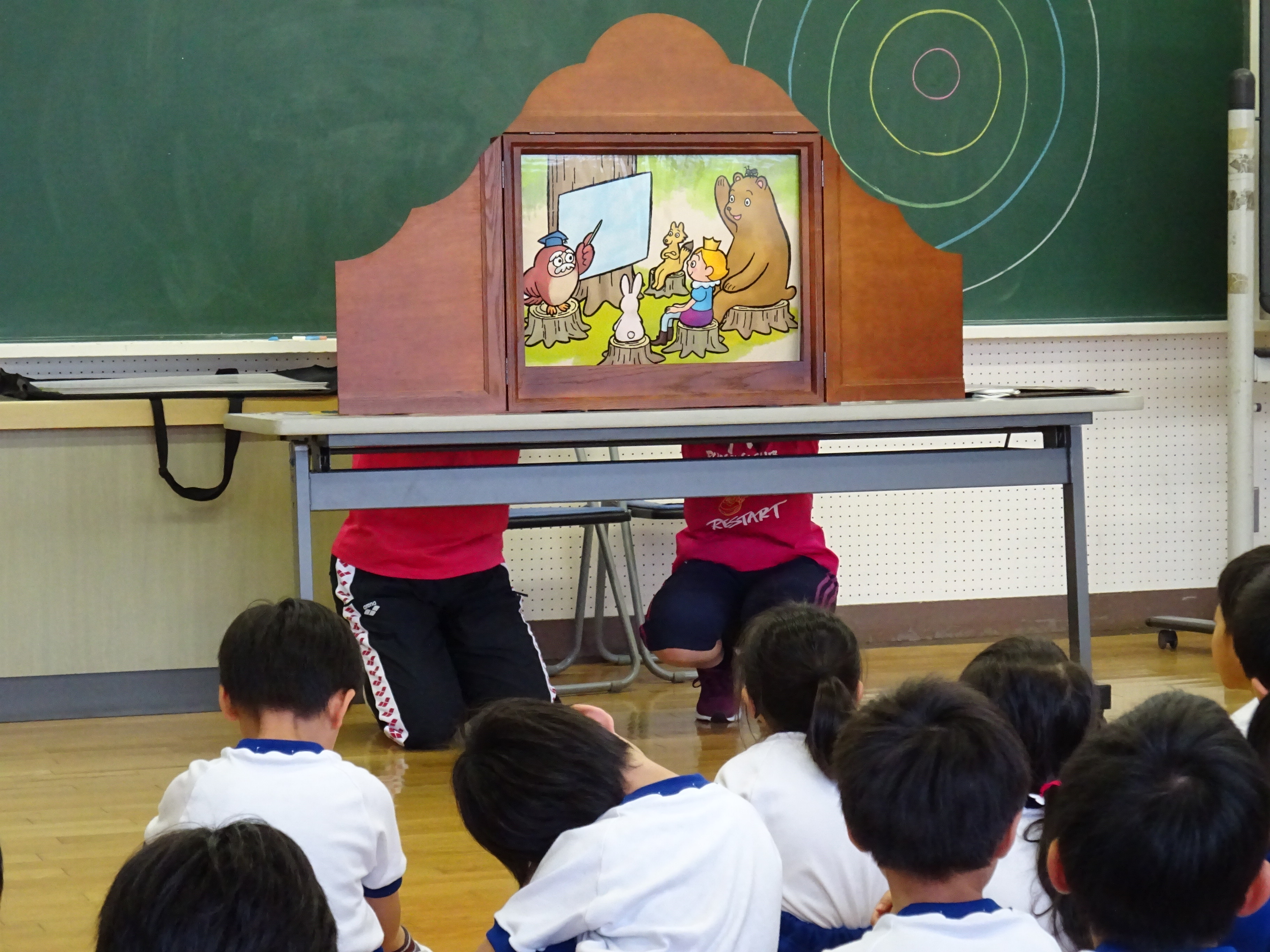 紙芝居を見ながら、2011年3月11日の東日本大震災による大きな揺れや津波によって、原子力発電所で事故が起きて放射線が漏れてしまい、各地に広がった放射線を取り除くために除染作業が行われたことや、モニタリングポストによって放射線量が常時測定されていることなどを教わりました。