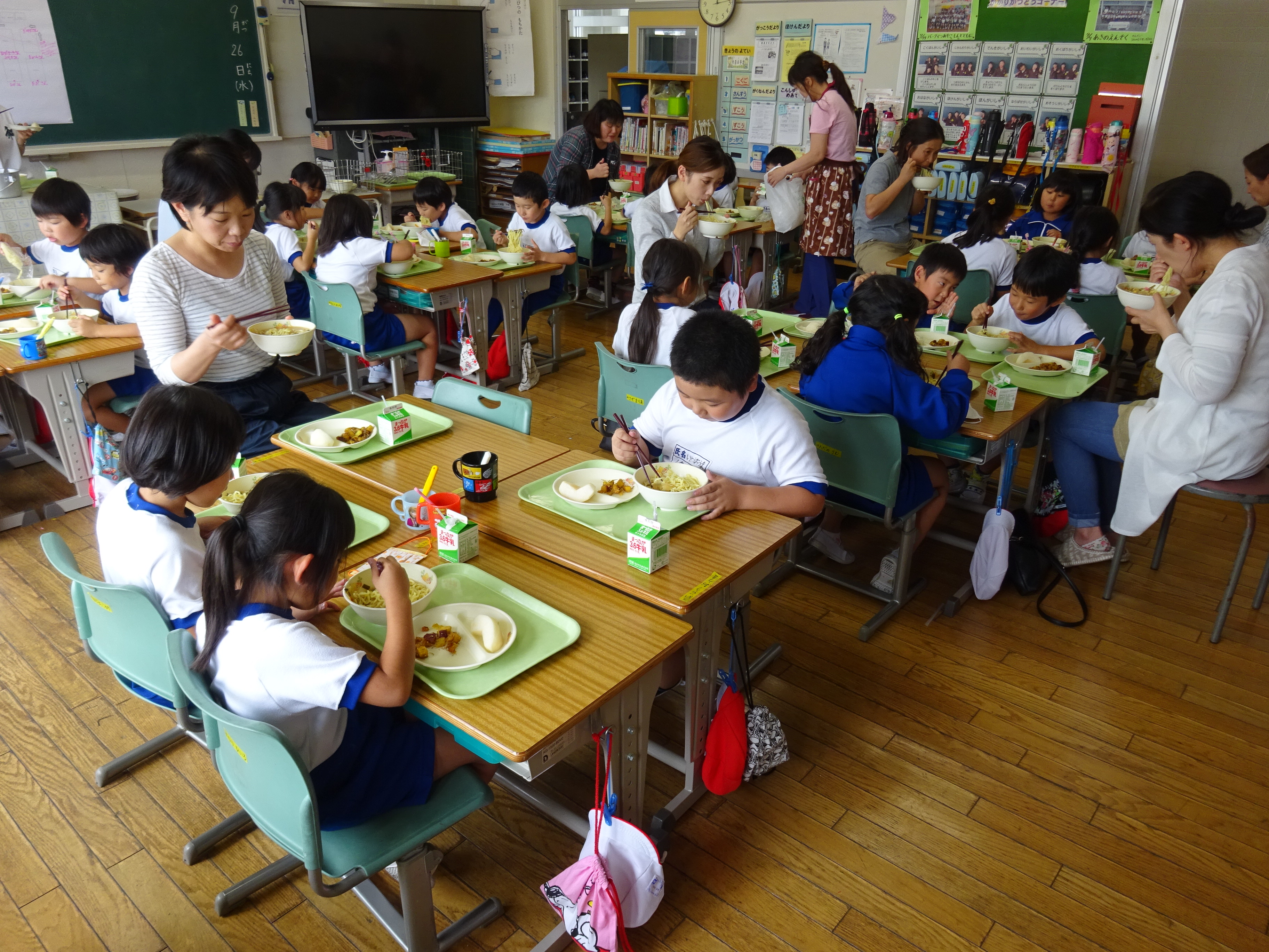 今日は25名の保護者の皆さんが参加され、子どもたちと一緒に給食を食べました。