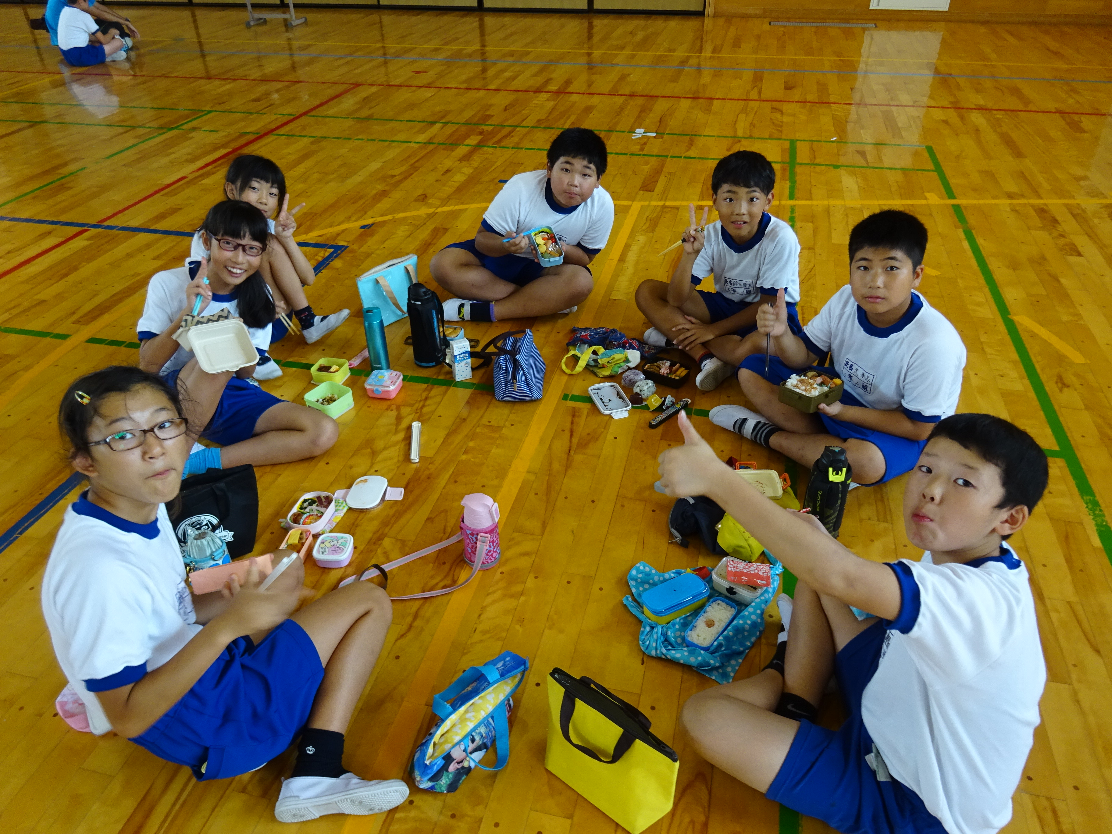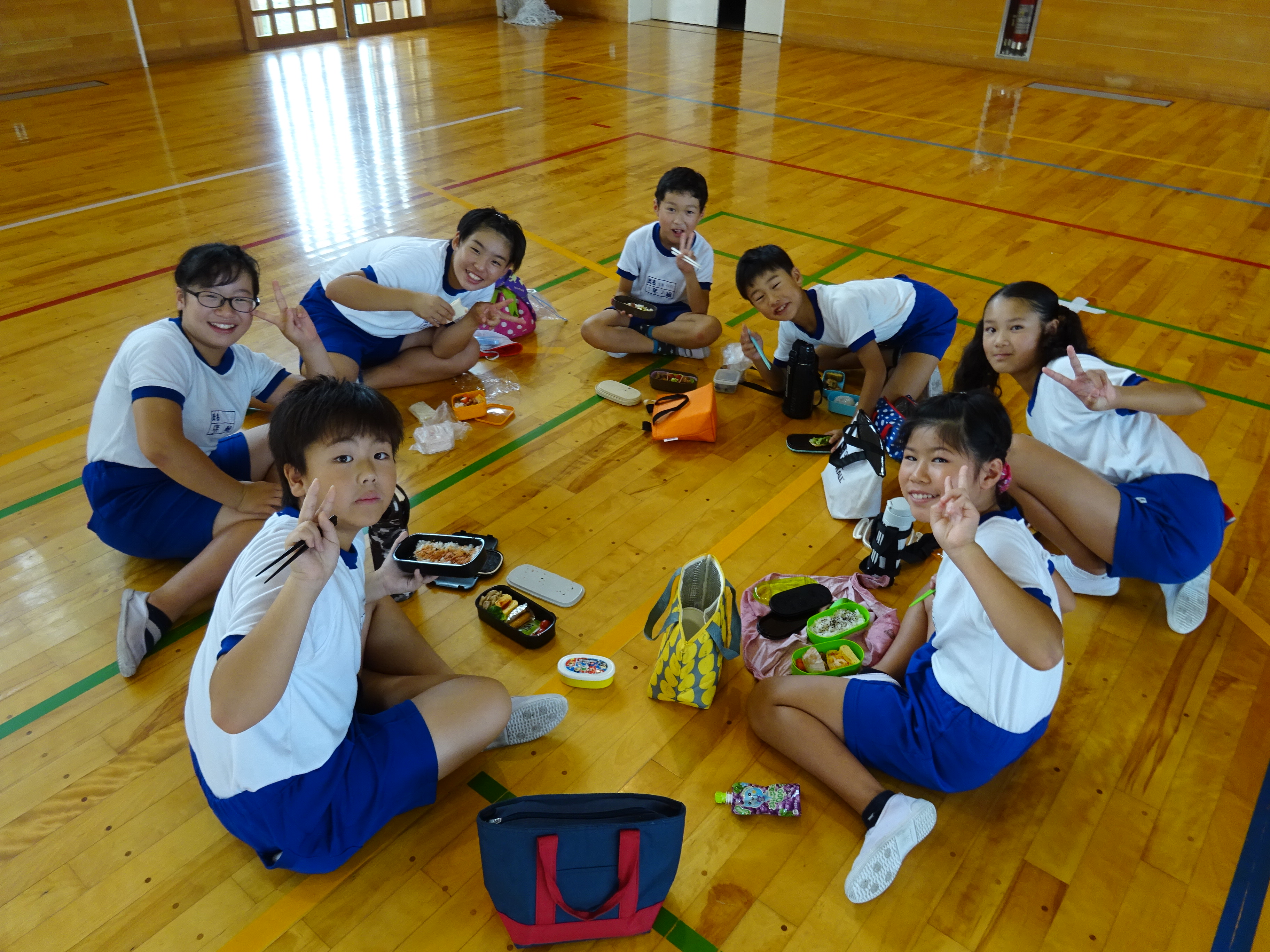 お昼はみんなで体育館に行って、宿泊活動の際の班ごとに集まってお弁当を食べていました。