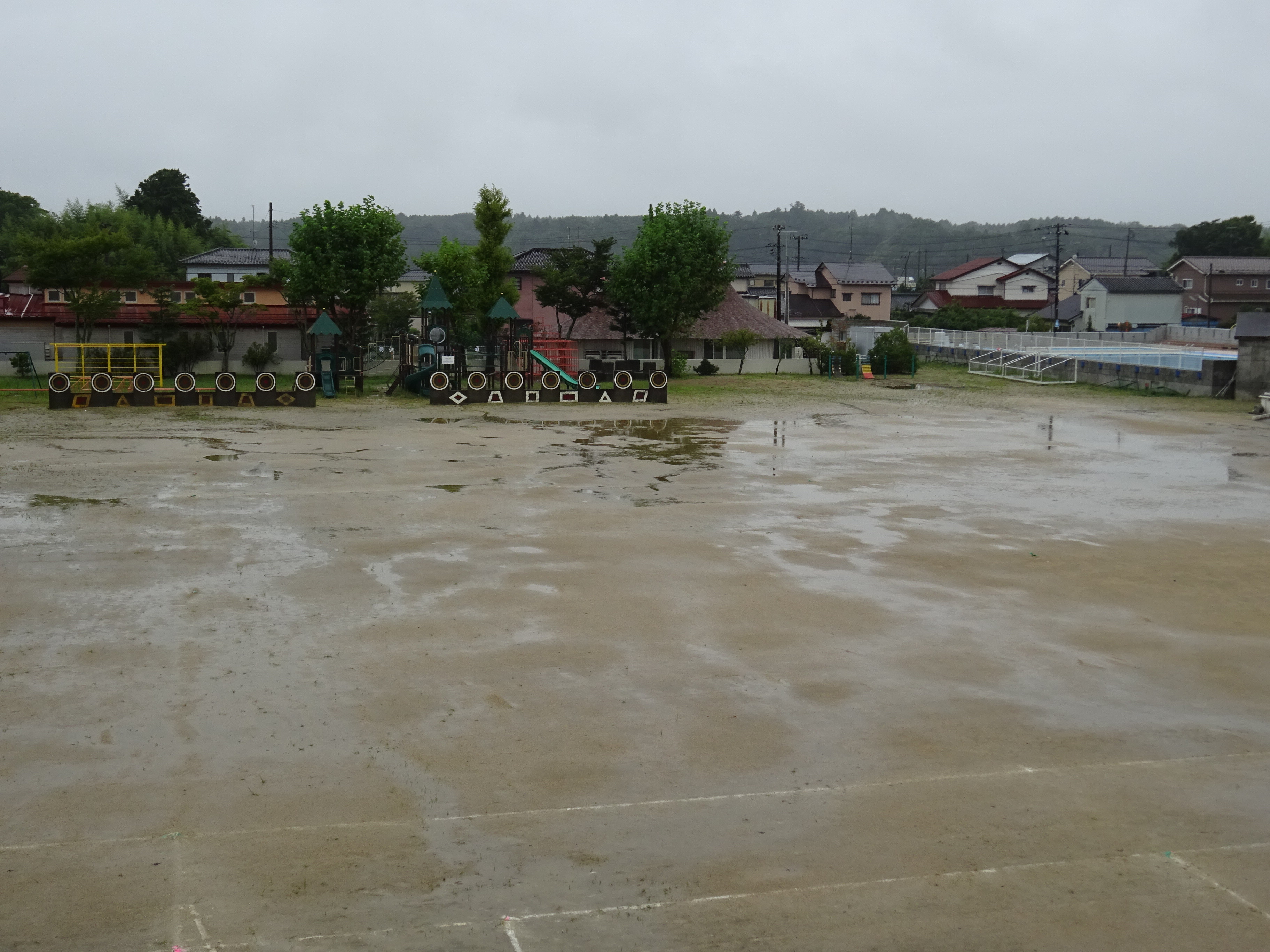 今日は雨模様の一日で、校庭には大きな水たまりがいくつもできています。