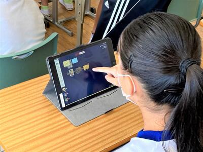 現在、外国語の授業や学習支援ソフトを使った個別の学習など、タブレットを活用した学習を行っています。