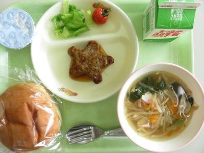 今日はセルフハンバーガーです。丸パンに、星形ハンバーグと野菜を上手にはさんで食べましょう。その他に今日は南相馬産のミニトマト『プチぷよ』がついています。ミニトマトはもともと飛行機の機内食用に作られたそうです。見た目のかわいさと、すぐに食べられる手軽さから私たちの間に広まりました。普通のトマトよりミニトマトの方が栄養が多いなど、小さい中に栄養がギュッとつまっています。ミニトマトの中でも特に『プチぷよ』は、甘みの強いトマトです。さあ、『プチぷよ』を食べてみましょう。
