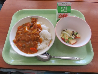 本日の献立は,秋味カレー,福神漬け,さいかサラダ,牛乳です。秋味といえばキノコ,シメジ,タモギタケ,エリンギが入っていました。