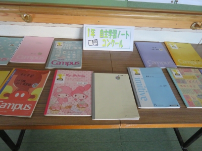 学習委員会主催で,自主学習ノートコンクールを実施し,廊下に展示しておりました。本日のお昼の放送で委員長より,1年生5名,2年生6名,3年生8名の優秀賞が発表されました。友達の良いところにならって,これからもお互いに高めあっていきましょう。