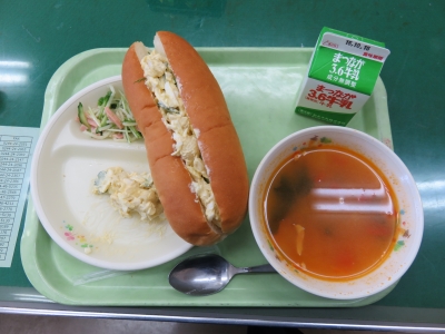 本日の献立は,セルフたまごサンド,大根と水菜のサラダ,ミネストローネ,牛乳です。