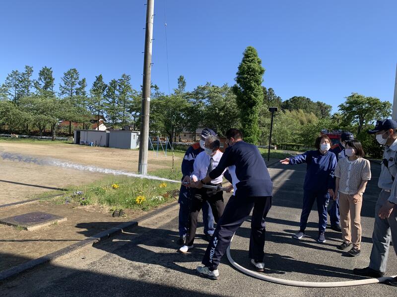 南相馬消防署鹿島分署の方に、校舎内の消火栓の使用の仕方を教えていただき、放水訓練を実施しました。