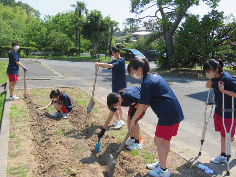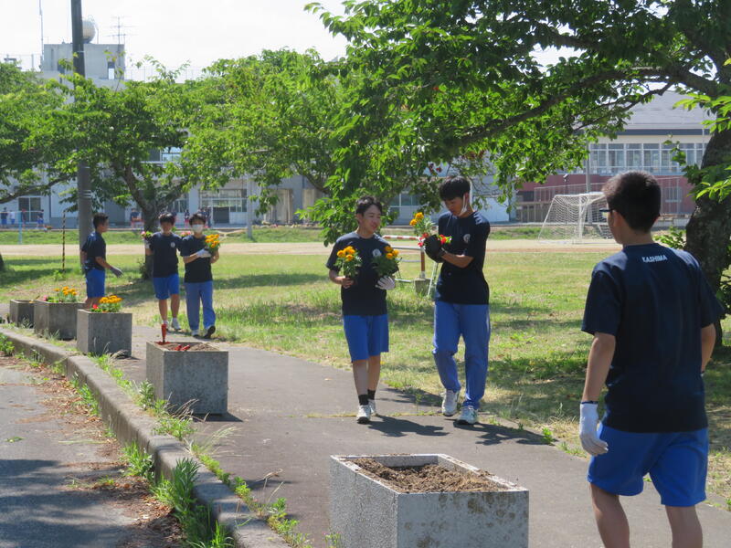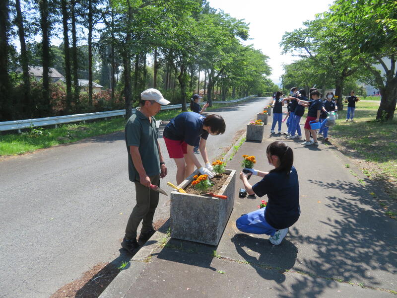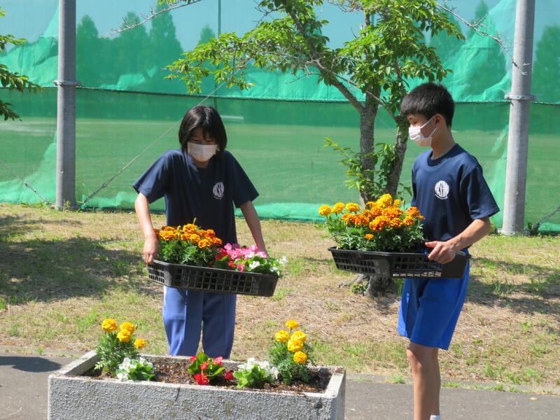 2学年で緑化活動を実施しました。地域の桜つづみの会の皆様と一緒に西校門からの通学路と正面玄関前の花壇の花植えです。色とりどりの花が校地を彩ります。来校の際には、是非ご覧下さい。