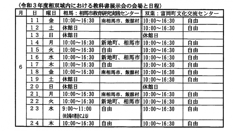 相双地方の2会場は、ここ南相馬市から少し遠いですが、お子さんが使っている教科書以外の教科書会社が、どんな内容を書いているのかぜひ、ご覧下さい。なお、会場によって、展示日時が違っていますので、ご注意ください。