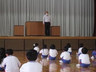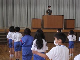 本日15日の業間時に全校集会を体育館で開き、プール開きを行いました。