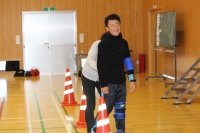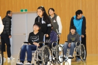 次に,手足にサポーターや重りを装着して動きを制限し,お年寄りの方々が移動するのにどれだけの苦労があるのかを体験しました。この体験を通して,お年寄りの方々の脇を乱暴に走り抜けたり,ぶつかったりすることがどれだけ危ないことなのかを考えることができました。さらに視界を狭くする体験では,視野の狭さが歩くことの妨げになることを実感することができました。車いす体験では,2人組になって障害物を乗り越えたり直角に曲がったりする練習をしました。