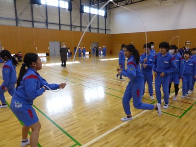○2月24日(水)のお昼休みに、全校児童で大なわ大会を行いました。体育委員会を中心に集会を進め、2分間で何回とべるのかを競いました。それぞれの学年が団結し、一生懸命取り組む姿が見られました。これからも、大なわをはじめ、様々なスポーツに親しみ、体力向上に努めてほしいと思います。