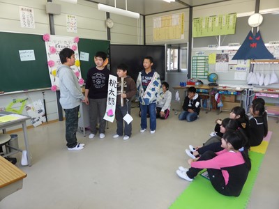 ○3月3日(木)の2校時目に、6年生を送る会を行いました。5年生を中心に会の企画・運営を行い、在校生と卒業生でゲームを行ったり、在校生から贈り物を渡したりしました。その後、先生方で歌を歌い、6年生も歌やお礼の言葉を発表しました。卒業まで残りわずかですが、小高小学校で学んだことを中学校で大いに発揮してほしいと思います。