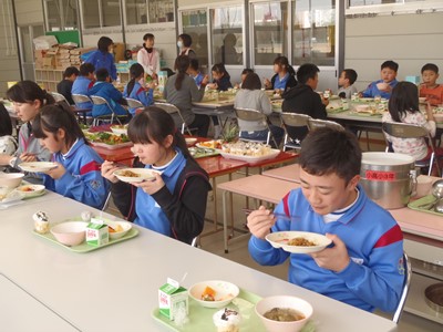 ○3月8日(火)にバイキング給食を行いました。1~2年生は1年生教室で、3~6年生は多目的室で実施しました。プチおにぎり、クロワッサン、やきそば、エビフライ、鶏肉のからあげ、豆腐ハンバーグ、小松菜のきんしあえ、フルーツ盛り合わせ、カップケーキ等、いろいろな種類の料理が並び、子どもたちはうれいしそうに給食を食べていました。給食センターの調理員さんたちにも、様子を見にきていただきました。給食を作っていただいた調理員さんをはじめ、会場の準備から片付けまで協力いただいた先生方、担任の先生方等、周りの人たちに改めて感謝の気持ちをもち、学校生活を送ってほしいと思います。