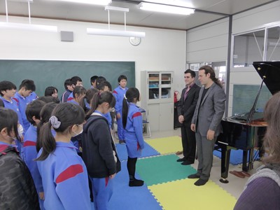 ○3月10日(木)に音楽鑑賞を行いました。ピアニストとして世界で活躍する「パノス・カラン」さん、フルート演奏者の「ザック・タルパゴス」さんをお迎えし、音楽室で演奏を披露していただきました。東日本大震災以降、福島県を訪れ、中学校との共演を果たしたり、福島青年管弦楽団の方を、ロンドンに招いて合同コンサートを開いたりと、幅広くご活躍されています。とても貴重な時間を過ごすことができました。