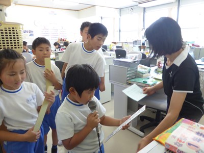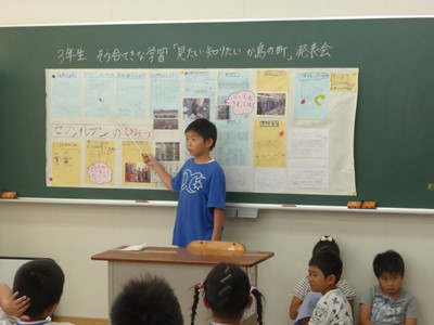 ○3年生の総合的な学習の時間に、「見たい知りたい 鹿島の町」という学習を行いました。調べたことを各グループでまとめ、7月15日のお昼休みに発表会を行いました。他の学年の友達や保護者の方も見にきてくれました。「セブンイレブンのひみつ」「男山八幡神社のひみつ」「さくらホール、万葉ふれあいセンターのひみつ」