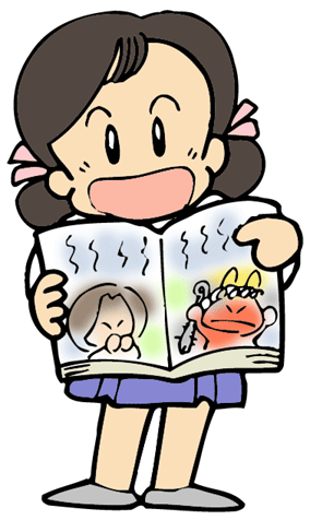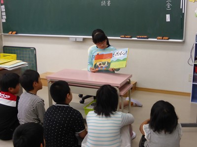○「みんなの発表」の様子です。図書委員が各学年を訪問し、読み聞かせをしています。各学年で学習したことの発表、委員会活動としての発表、各種行事の発表等、全体の前で発表する機会を計画的に取り入れていく予定です。