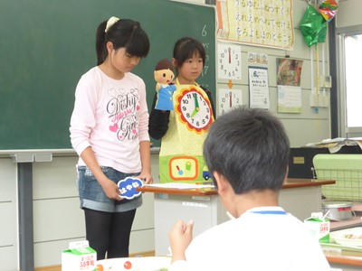 ○「みんなの発表」の様子です。前回は学年の発表の様子でした。今回は委員会活動の発表の様子です。食生活は、健康な体つくりに欠かせない大切な役割の1つです。朝ご飯をきちんと食べ、規則正しい生活を送ること。「はやね・はやおき・あさごはん」の大切さを発表しました。子どもたちが一人ひとり意識して生活をしてほしいと思います。