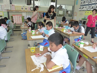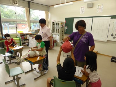 ○7月1日(水)に、授業参観を行いました。写真は2年生の授業の様子です。国語の授業で、親子でふろしきを作っている様子です。各担任の先生方が、授業の準備をして、熱心に指導する姿が見られました。