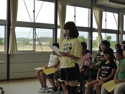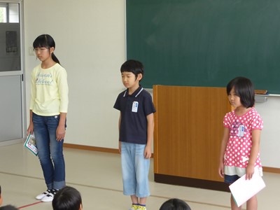 2015年7月17日 13時03分今日で71日間の1学期が終わりました。7月17日(金)の2校時目に、多目的室で終業式を行いました。校長先生からのお話の後、1、3、5年生の代表児童が、「1学期の反省と夏休みのめあて」を発表しました。一人一人が1学期を振り返り、夏休みや2学期に向けて形だけのめあてになることなく、継続して取り組んでほしいと思います。