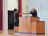 終業式の後は、よい歯の表彰を行いました。5月に行った歯科検診の結果、むし歯がなかった子ども達の表彰です。賞は3つに分かれており、むし歯がない「歯ッピー大賞」、むし歯の治療が完了していた「歯ッピー賞」、検診後むし歯の治療を頑張った「がん歯り賞」です。また、歯垢の付着がないと診断された人には「歯みがき賞」を渡しました。