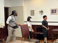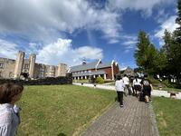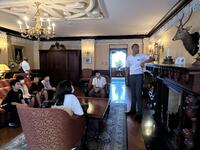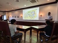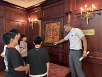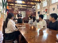 チェックインの後は、マナーハウスツアーです。館内の施設を英語での説明を聞きながら見学しました。イギリスの歴史や文化を知ることもできたようです。ユーモアを交えつつ、楽しく教えていただき、積極的に答える姿もありました。子ども達からは、「英語が早くて少しわからない部分もあったけど、わかるところも結構あった」、「お話を聞いてて楽しかった」の声がありました。