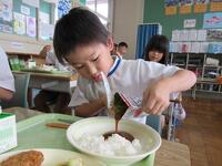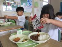 今日の給食は、9月1日の防災の日にちなんだ「防災対応献立」です。万が一のために、学校に備蓄している『ヒートレスカレー』を使った献立です。ヒートレスカレーは、温める必要がなく、このまま袋から出して食べることができる便利な『非常食』のひとつです。昨年、社会科で災害や防災について学習した5年生では、給食と学習をつなげて考えている様子もありました。また、他の学年でも「あたためなくても食べられるんだね」、「賞味期限が長い!」など、いろいろな気づきがあったようです。