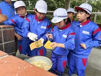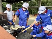 今日の夕飯は野外炊飯です。班で分担、協力して、かまどを作り、ご飯を炊き、カレーを作ります。
