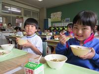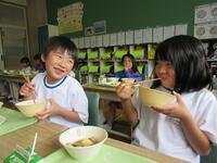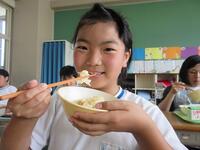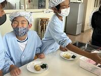 今日の給食は、相馬野馬追にちなんだ「いざ、出陣」メニューです。出陣の儀式「三献の儀」には、打ちアワビ、勝ち栗、昆布の三品をそろえることが昔から慣習として守られてきました。今日の給食はアワビの代わりにホタテの貝柱を入れたごはん、塩昆布入りのきゅうりづけ、それに勝ち魚 である「かつおの揚げ煮」と「勝ち栗」の出陣メニューです。