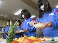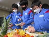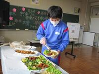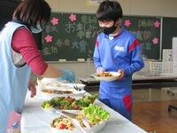 今日は6年生の「卒業お祝い給食」で、バイキング形式の給食です。バイキングというと、好きなものを好きなだけ食べるというイメージがありますが、6年間の食の学習をふりかえり、マナーや健康のことを考えて食べる学習の意味もあります。