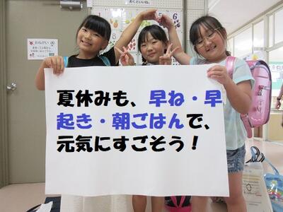 今日の3時間目に、第1学期終業式を行いました。校長先生からは、勉強でも、体も、心もみんな伸びました。これから夏休み、2学期となっていくにつれてもっと伸びていきますよとお話をいただきました。また夏休み中は、事故にあわない、けがをしないよう気をつけて過ごしましょうと話もされました。みなさんよい夏休みにしましょう。
