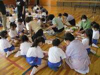 その後、火の玉の作り方を教えていただき、低学年、中学年、高学年に分かれて作りました。本当にみんな一所懸命に作っていました。