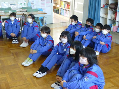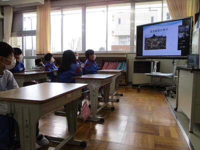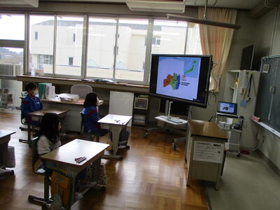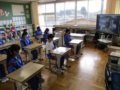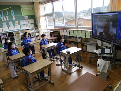 校長先生からは、東日本大震災、原子力発電所の事故の様子をお話いただきました。小高にも大きな地震と津波がやってきて、風景が変わってしまったこと、多くの人の大切な命が失われてしまったこと。どの教室でも、画面の中の校長先生の話を真剣に聞くことができていました。