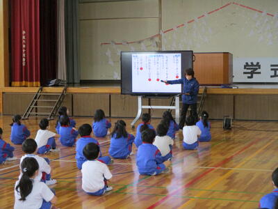6年生は、小高小の一年を振り返って、「入学式」「1年生をむかえる会」「運動会」「学習発表会」「走ろう会」「豆まき集会」の寸劇をしてくれました。入学式や1年生をむかえる会に1年生は大喜び!