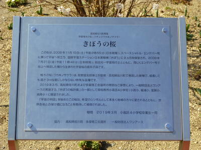 2019年に小高区4小学校に贈呈していただいた「きぼうの桜」が咲き始めました。この桜は、成長しても3m程度にしかならない稚木の桜(ワカキノサクラ)という特殊な品種です。2008年11月15日にスペースシャトル・エンデバー号に乗って宇宙に旅立ち、国際宇宙ステーション日本実験棟「きぼう」に8ヶ月半保管され、2009年7月31日に若田光一宇宙飛行士とともに地上に帰還した種から生まれた宇宙桜の直系子孫だそうです。