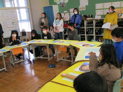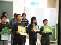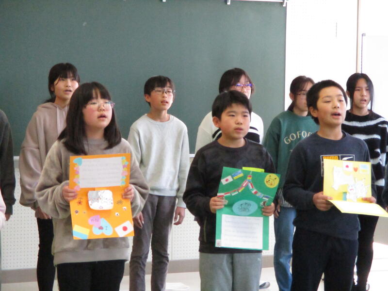 6年生が英語で、クリスマスカードのお礼を言ったり、南相馬市や野馬追、小高小学校の紹介をしたりした後、5・6年生が平和への願いをこめて「世界がひとつになるまで」を歌いました。児童が作ったカードやパネルは、小林様を通じてウクライナに送っていただきます。