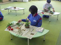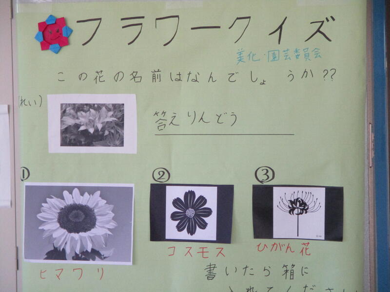 昇降口には、美化園芸委員会のフラワークイズがあります。(写真は正解発表後)