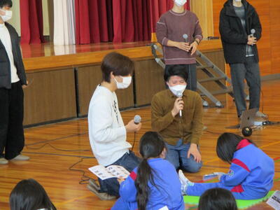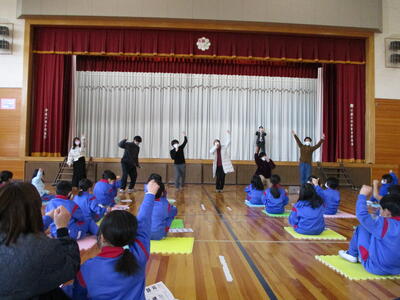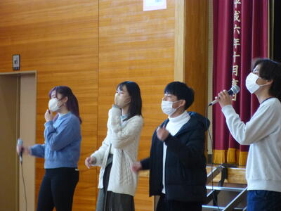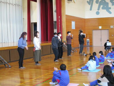 2月27日(月)大阪大学アカペラサークル「うたゆい」の皆さんにご来校いただき、アカペラコンサートが行われました。コロナ禍のため、令和元年以来、3年ぶりのコンサートとなりました。レパートリーの中から、「うたゆいのテーマ」「オー・シャンゼリゼ」「カントリーロード」などを歌っていただくと、ボイスパーカッションや低音パートを含めた複数の歌声が重なり、美しいハーモニーとなって体育館に響き渡りました。子どもたちはとても楽しそうに演奏に聞き入っていました。演奏の合間には、メンバーの方々への質問コーナーも設けていただいたので、子どもたちは、大学生のお兄さん・お姉さんたちと触れ合って楽しい時間を過ごすことができました。「うたゆい」の皆様、ありがとうございました。