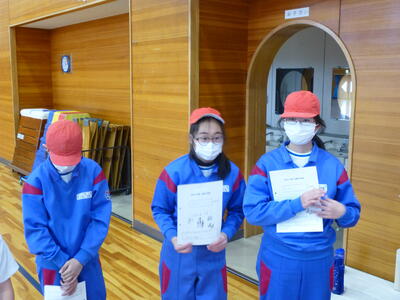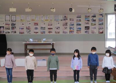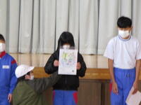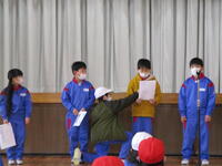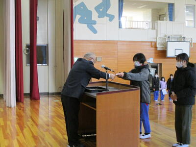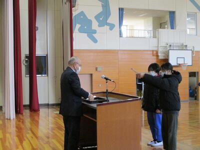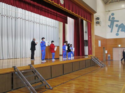2月7日(火)全校集会で、校内なわとび記録会と税に関する絵はがきコンクールの表彰を行いました。